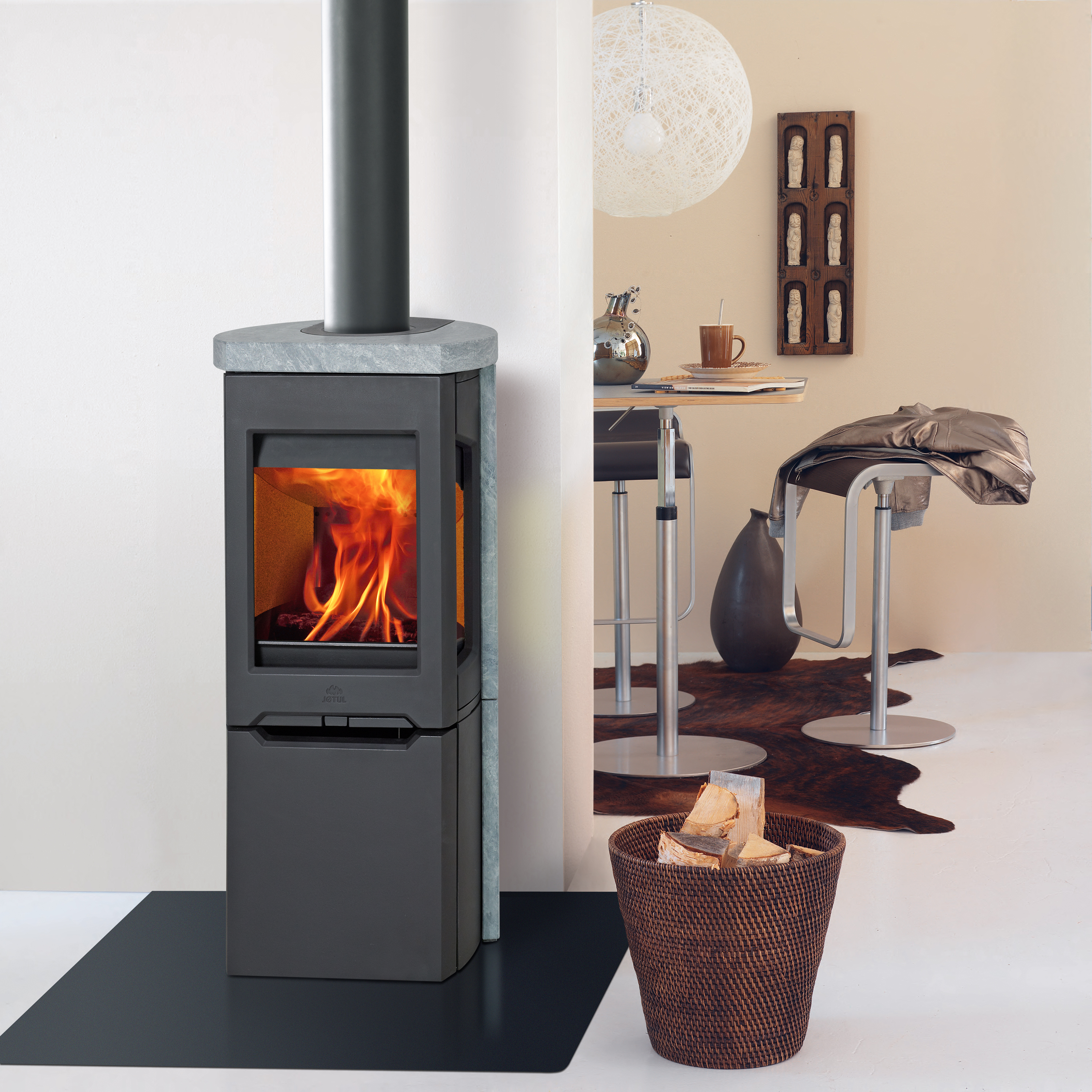 Jotul F 165 S jest umieszczony na żeliwnej podstawie z drzwiczkami, gdzie można ukryć potrzebne akcesoria. Można także zainstalować dołączony zestaw kominkowy, który został zaprojektowany specjalnie dla tego modelu.