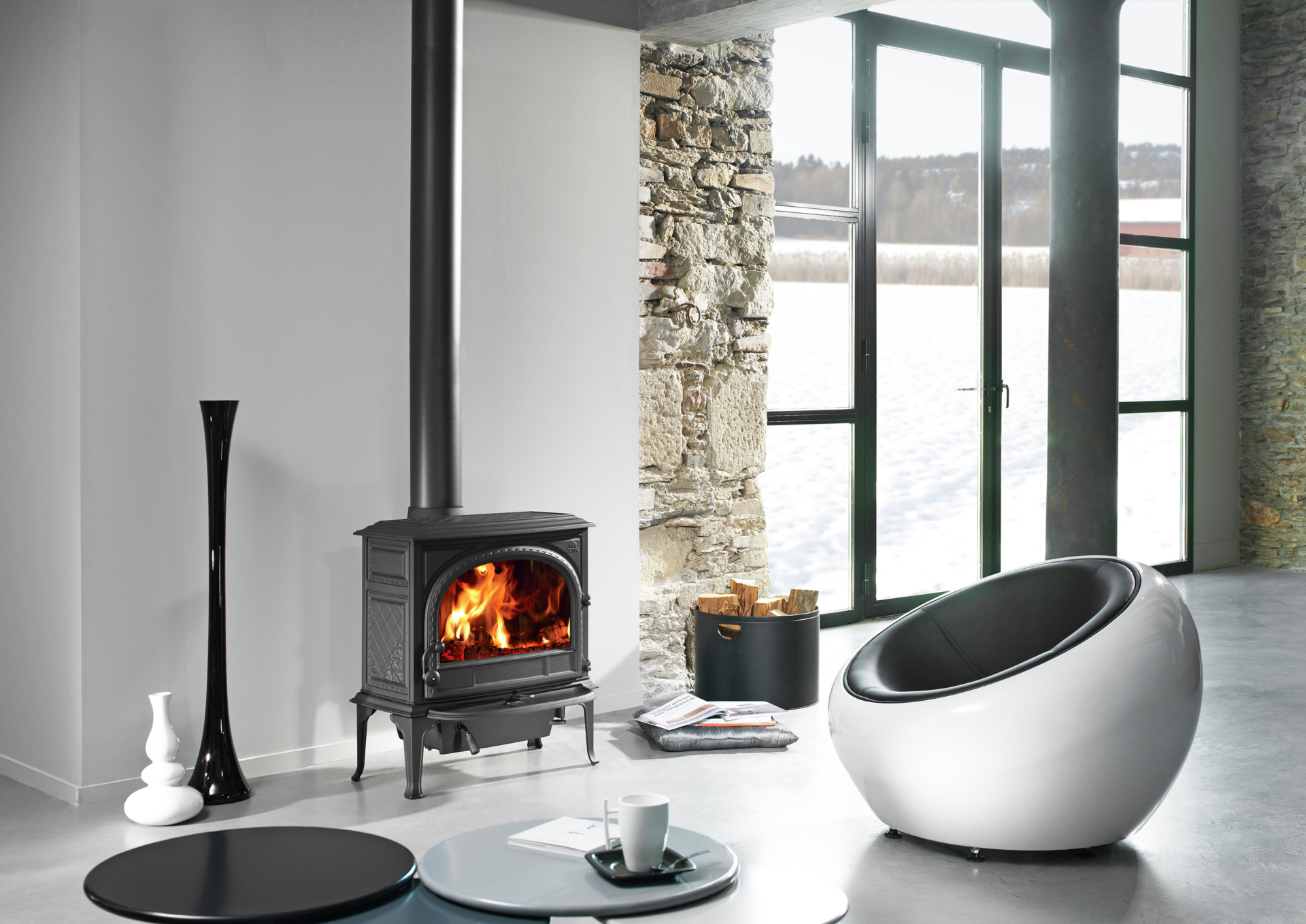 Piec posiada duże szklane drzwi, które zapewniają doskonały widok na płonący ogień, ozdobiony jest wzorem który przedstawia część wybrzeża Norwegii.