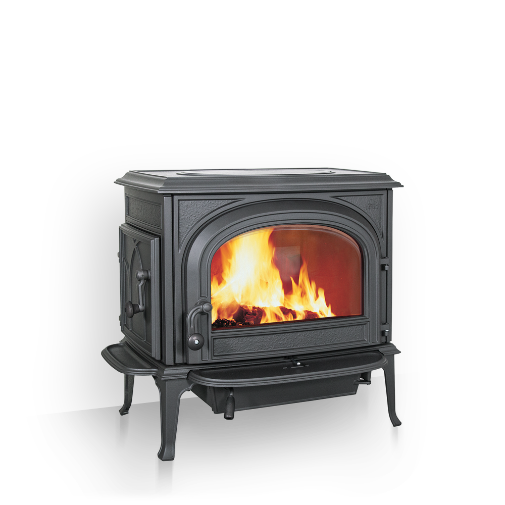 Jotul F 500 SE BP. Model ten posiada duże przeszklone drzwi bez łuków przez co podziwiać można wspaniały widok ognia. Przez boczne drzwi lewe wchodzą polana o długości ponad 55 cm. Piece z tej serii pochodzą z wielkiej rodziny pieców w amerykańskim stylu kolonialnym.